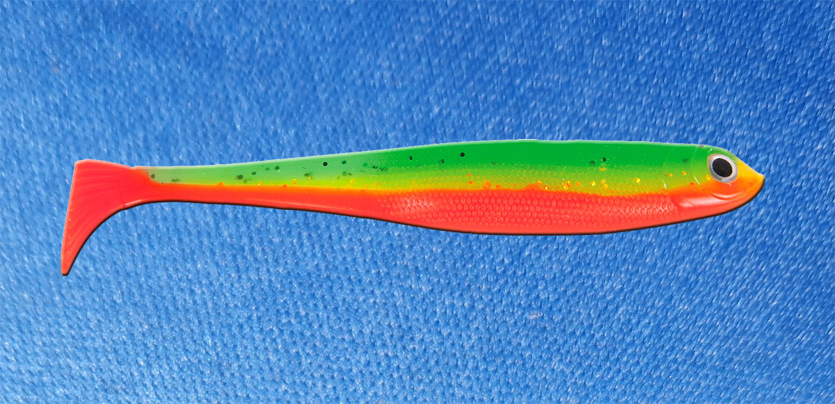 Sein großer Schaufelschwanz arbeitet bereits bei leichtem Zug bzw. beim Absinken verführerisch und verleiht dem Gummifisch eine flankende Bewegung.