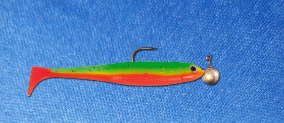Die fängigsten Farben in einem Gummifisch vereint.Möhrenrot und grün mit Glitter.