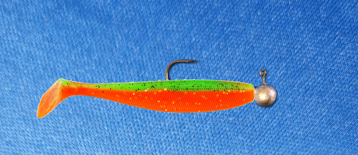 Sein großer Schaufelschwanz arbeitet bereits bei leichtem Zug bzw. beim Absinken verführerisch und verleiht dem Gummifisch eine flankende Bewegung.