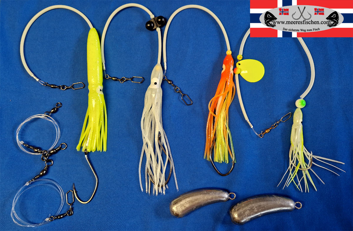 Vier Mundschnüre aus hochwertigem Material für maximale Haltbarkeit und Stärke.In 4 Ausführungen mit Leuchtschlauch, Lock- und LeuchtperlenZwei Bleie mit folgenden Gewichten:330g425g