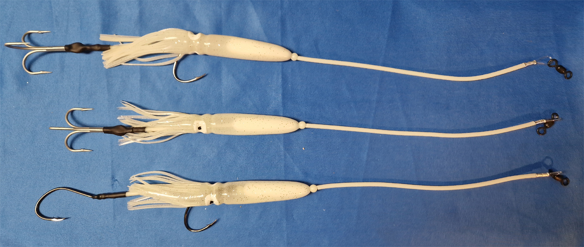 Meine Versionen:Wer mich pur als Drillingsversion mag, bekommt mich mit einem Drilling am Ende der Mundschnur.Wer mich als Drilling mag mit einem zusätlichen Haltehaken um mit ganzen Köderfischen zu angeln, kein Problem. Der Haltehaken sitzt direkt in meinen TentakelnWer keine Drillinge mag der kann mich auch als Doppelhakensystem bekommen mit einem Einzelhaken in meinen Tentakeln und einen am Ende der Mundschnur.