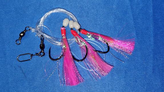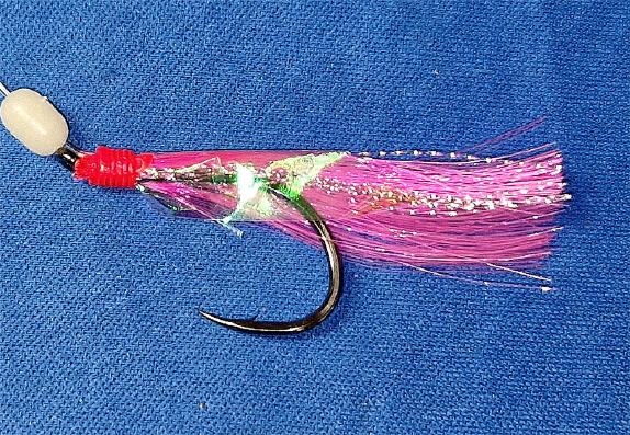 Lockvogel: Pinkfarbene Federn dienen als Lockvogel, um die Aufmerksamkeit der Fische zu erregen. Die Farbe Pink hat sich in den letzten Jahren als sehr fängig bewiesen und ist kaum noch wegzudenken.